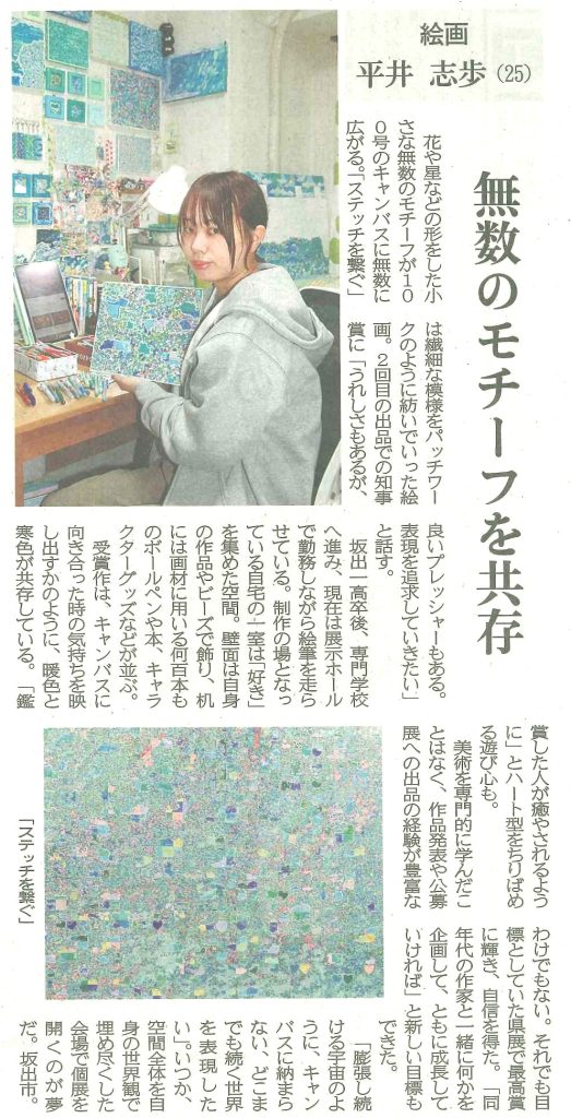 平成30年度にファッションデザイン科を卒業した平井志歩さんが第89回県美術展覧会の絵画部門にて最高賞となる知事賞を受賞しました。作品「ステッチを繋ぐ」は、花や星などの小さなモチーフをパッチワークのように紡いで描いた絵画作品で在学時に培ったインスピレーションを強く感じる素敵な作品です。