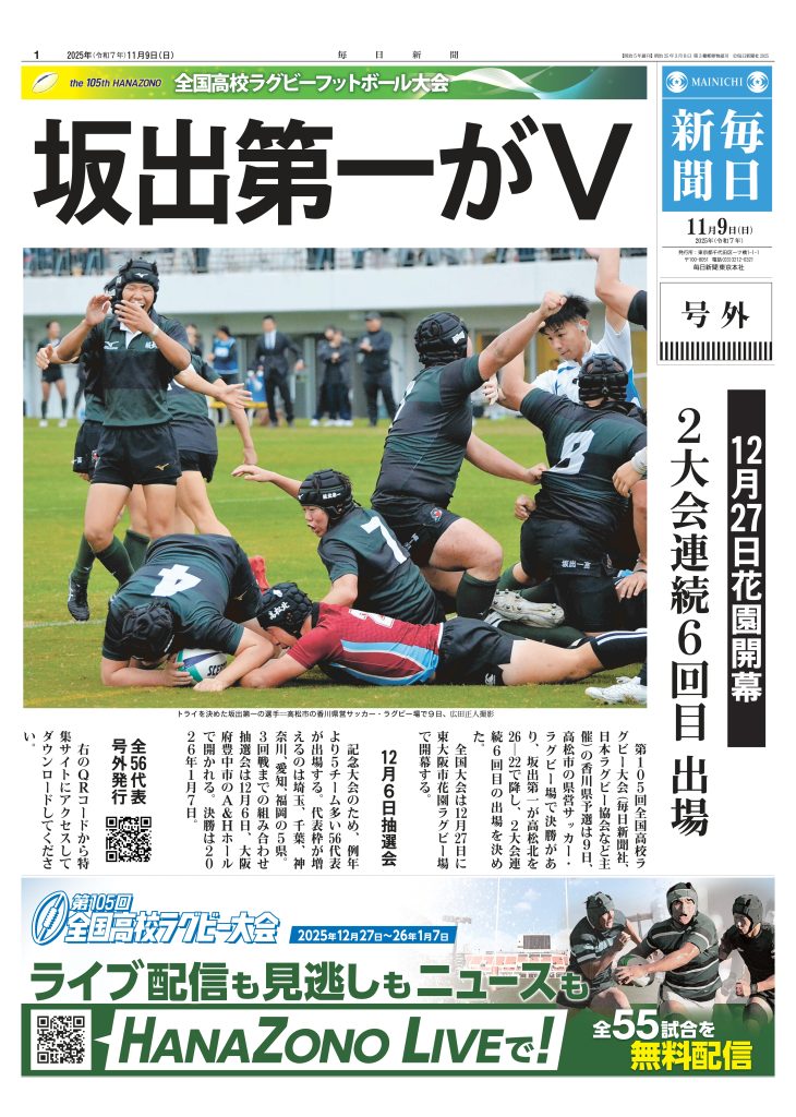 【毎日新聞】坂出第一が接戦制す 2大会連続の花園 全国高校ラグビー・香川