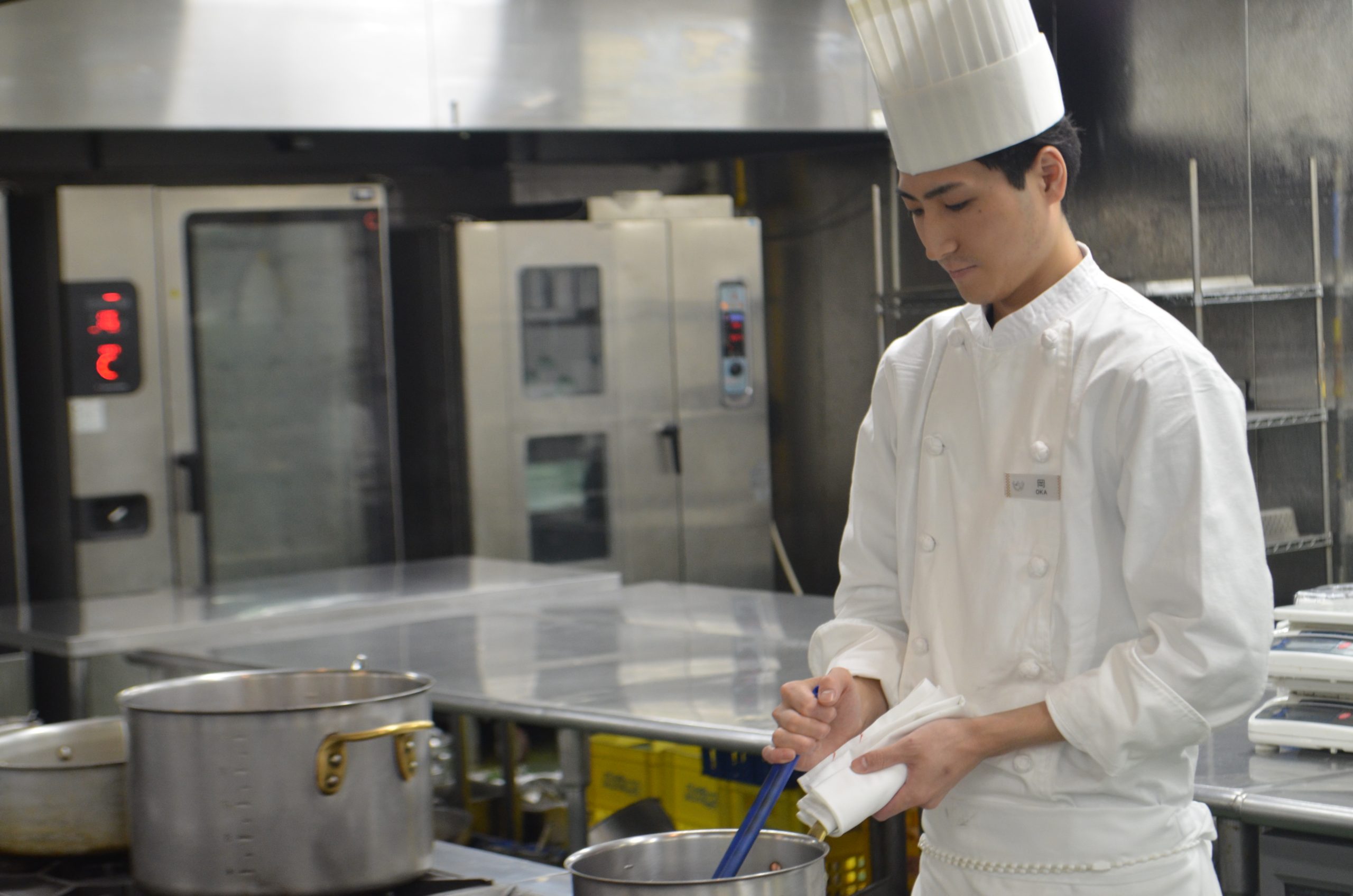 帝国ホテル大阪に入社して、現在、宴会調理部ホットセクションに所属しています。私はソシエと呼ばれるポジションで、メイン料理を仕切る担当として主にソースを作らせていただいています。フレンチ料理において、ソースは味の決め手となる重要なものです。3~4人前の料理ではなく、何百、何千人前の大量のソースの細かな調整することはとても難しいことです。一つひとつの工程を丁寧かつ素早く見極めて味の確認をしています。そんな仕事をするうえで、私が大切にしていることは、任された仕事に満足せず、自分の中で理想を持ち、緊張感を持つことです。ホテルにはウォーマーと呼ばれる保温機器もありますが、頼りすぎると料理の美味しさが失われます。お客様の食事スピードなど先を読み、お客様一人ひとりのクオリティーを上げるよう努めています。お客様からすると、帝国ホテルでの食事は特別な一日です。そして、その特別な時間を支える一皿として、お客様のお役に立てることはとても料理人冥利に尽きることだと感じます。ホテルで勤めて、レストランとの微妙な料理の役目の違いを感じます。もちろん『美味しい料理を作る』ことに違いはありませんが、お客様の利用する場面が違うということです。高校の時に、実習担当の先生がホテルとレストランでは違うと話していたことを思い出します。当時は、料理という大きなくくりでしか考えていませんでしたが、お客様の存在を知った今は理解できますし、帝国ホテルの一員であることが自分へ大きなやりがい生んでくれています。お客様を第一に考えて料理を作ることを大切に日々精進しています。